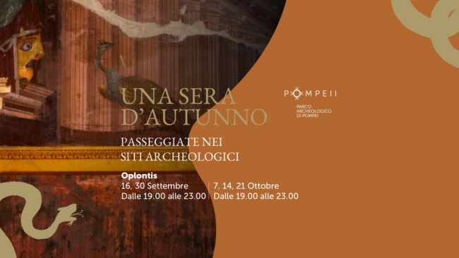Dal 16 settembre presso i siti del Parco archeologico di Pompei, Villa Arianna e Villa San Marco a Stabia, Villa di Poppea a Oplontis e Villa Regina a Boscoreale, prendono il via gli appuntamenti serali della stagione autunnale. Ogni mese un sito diverso, con aperture serali al costo di 6 € ( 5 € + 1€ a sostegno del patrimonio culturale dell’Emilia Romagna danneggiato dall’alluvione ).