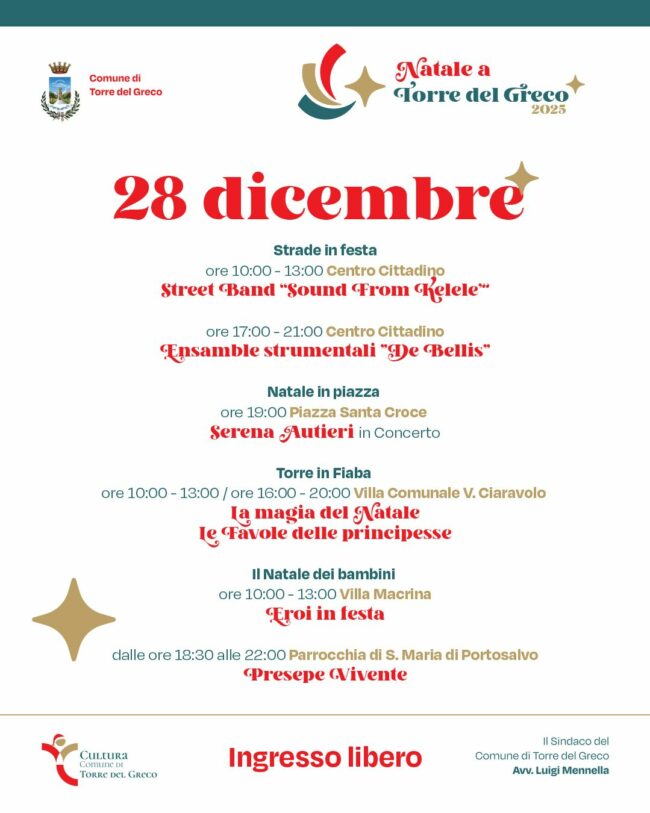 …sapori, luoghi, colori Luigi Mennella sindaco di Torre del Greco 𝙊𝙥𝙡𝙤𝙣𝙩𝙞 𝙚 𝙡𝙖 𝙈𝙖𝙜𝙞𝙖 𝙙𝙚𝙡 𝙉𝙖𝙩𝙖𝙡𝙚, 𝙚𝙘𝙘𝙤 𝙞 𝙥𝙧𝙤𝙨𝙨𝙞𝙢𝙞 𝙖𝙥𝙥𝙪𝙣𝙩𝙖𝙢𝙚𝙣𝙩𝙞 𝙞𝙣 𝙥𝙧𝙤𝙜𝙧𝙖𝙢𝙢𝙖 𝙖 𝙏𝙤𝙧𝙧𝙚 𝘼𝙣𝙣𝙪𝙣𝙯𝙞𝙖𝙩𝙖27 dicembre, h 20.30 – Basilica Madonna della NeveCantata di Natale29 dicembre, h 18.00 – Palazzo CriscuoloPresentazione del libro “Napolitiamo”28 dicembre, h 20.30 – Chiesa S. Michele (Rovigliano)Pina Di Grazia in…