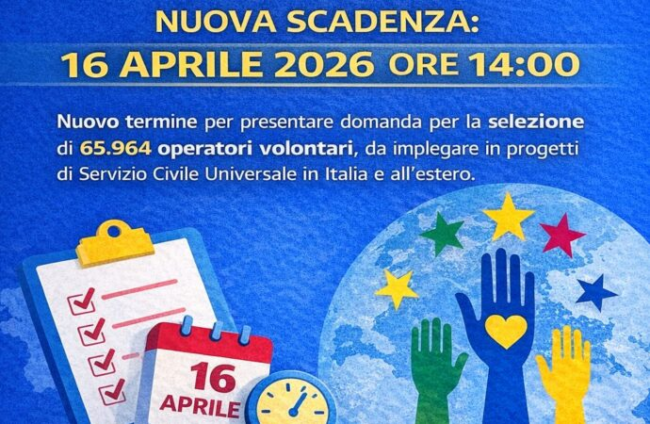 È stata disposta la proroga dei termini per la presentazione delle domande relative al Bando per la selezione di 65.964 operatori volontari da impiegare in progetti di Servizio civile universale, da realizzarsi in Italia e all’estero. Con decreto del Capo del Dipartimento per le Politiche giovanili e il Servizio civile universale n. 386/2026 del 7…