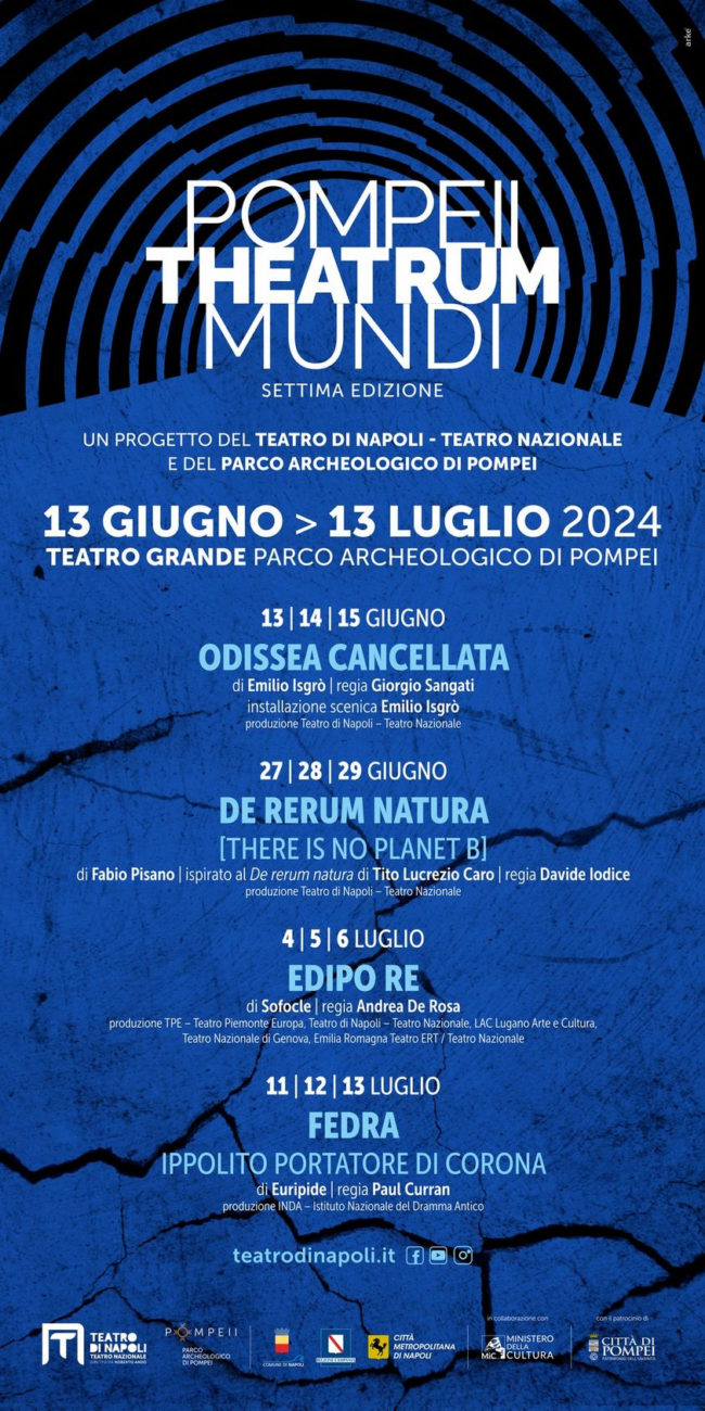 Un progetto del Teatro di Napoli – Teatro Nazionale e del Parco Archeologico di Pompei dal 13 giugno al 13 luglio 2024 al Teatro Grande di Pompei. Dalla ODISSEA CANCELLATA di Emilio Isgrò con la regia di Giorgio Sangati su installazione scenica “in situ” di Emilio Isgrò al DE RERUM NATURA di Fabio Pisano con la regia di Davide Iodice a EDIPO RE di Sofocle con la regia di Andrea De Rosa a FEDRA, Ippolito portatore di corona di Euripide con la regia Paul Curran il prestigioso programma di testi classici verrà presentato al pubblico in 12 sere d’estate in uno dei luoghi più belli al mondo.