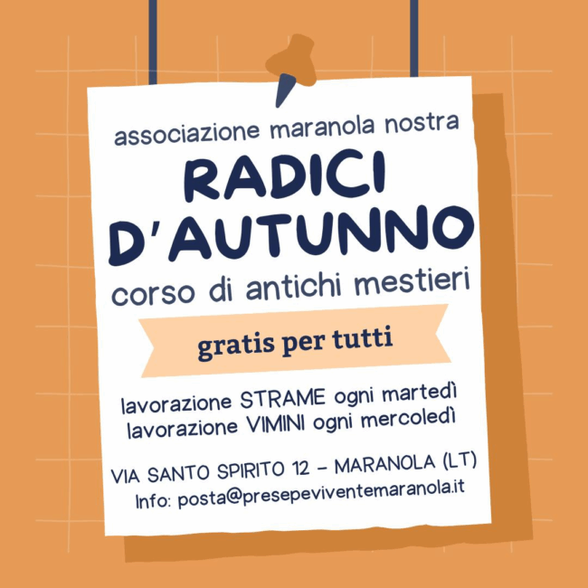 Presepe Vivente di Maranola Torna a grande richiesta il corso di mestieri antichi, gratis per tutti, tenuto veri esperti del paese. Per informazioni e iscrizioni potete scriverci sui nostri canali social. Zio Michele, Antonio, Rita e Michele vi aspettano per tramandarvi antichi saperi. I corsi sono già iniziati, affrettatevi!!! Timar srl Torna a grande richiesta…