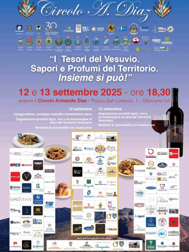 Quest’anno festeggiamo 25 edizioni di gusto, tradizione e divertimento! Sabato 27 e Domenica 28 settembre – Percorso enogastronomico e sensoriale nel cuore del centro storico di Boscoreale, tra vini locali, piatti tipici, artigianato e spettacoli.