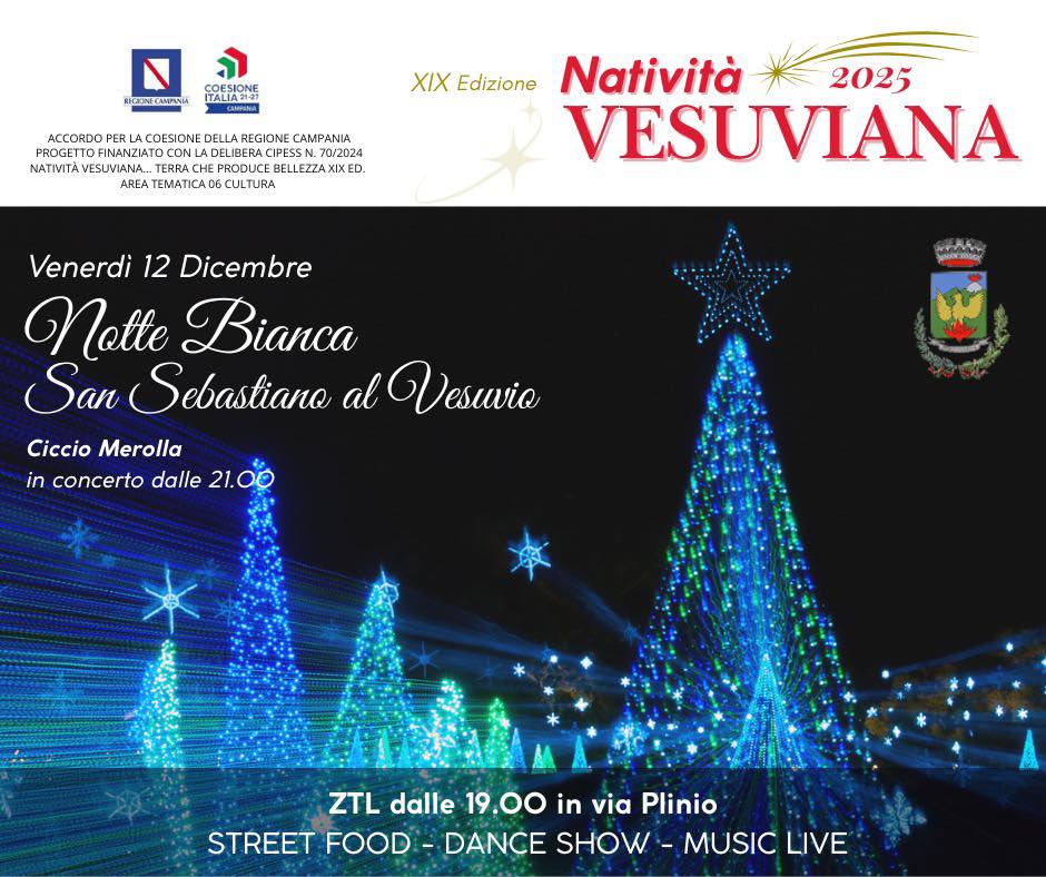 | In occasione della NOTTE BIANCA che si terrà nell’ambito della rassegna di NATIVITÀ VESUVIANA, il 12 dicembre a via Plinio avremo il piacere di ospitare il concerto di CICCIO MEROLLA e la sua band. Nell’occasione verrà allestita una ZTL che ospiterà Dance show e street food dalle ore 19.00. Peppe Panico Sindaco |