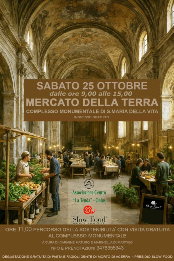 Sabato 25 ottobre 2025, dalle 9:00 alle 15:00, l’antico Complesso Monumentale di Santa Maria della Vita, nel cuore del Rione Sanità, apre le sue porte al Mercato della Terra di Slow Food Napoli, ospitato dall’Associazione Centro “La Tenda” – Onlus.