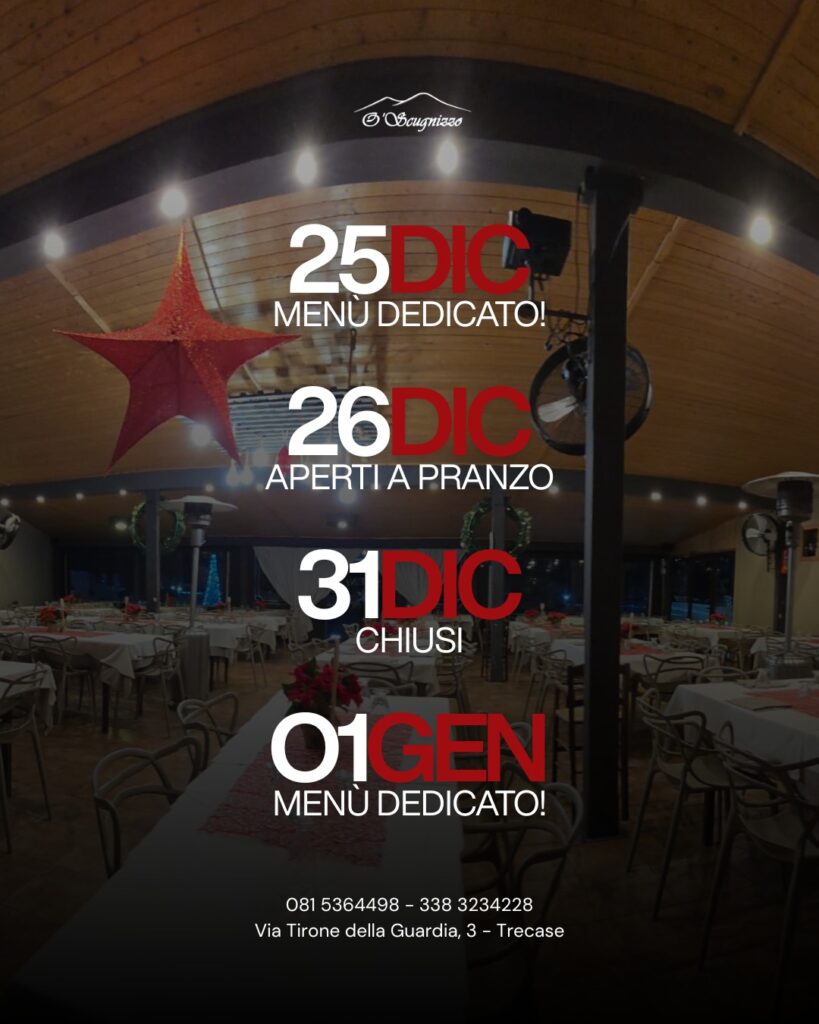 | 𝗥𝗜𝗦𝗧𝗢𝗥𝗔𝗡𝗧𝗘 𝗢’ 𝗦𝗖𝗨𝗚𝗡𝗜𝗭𝗭𝗢 Via Tirone della Guardia,3 80040 Trecase (NA) Email: info@ristoranteoscugnizzo.it Tel. 081 536 4498 – 8 dicembre (Immacolata) – 25 dicembre (Natale) – 1 e 6 gennaio ’26 (Capodanno ed Epifania) ! Aperti solo a pranzo (menù fisso). Ristorante O’ Scugnizzo – Trecase #sostiene il #progetto #Airav #casa #iVesuvio Cultura, Esperienze, Sapori Tipicità Locali, Turismo #sapori |