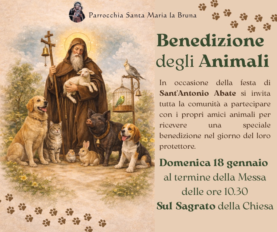 | Duplice appuntamento per domenica prossima! Al mattino, al termine della Messa delle 10.30, benedizione degli animali in occasione della festa di S. Antonio Abate A sera, Festa della Famiglia: Santa Messa con Rinnovo delle promesse matrimoniali e benedizione dei vedovi. |