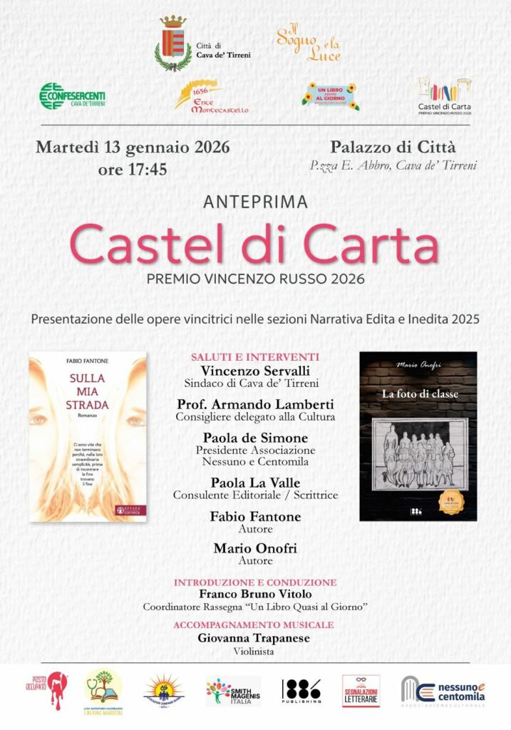 | Anteprima di Castel di Carta – Premio Vincenzo Russo 2026, questo pomeriggio martedì 13 gennaio 2026, alle ore 17:45, al Palazzo di Città di Cava de’ Tirreni, dedicato alla promozione della narrativa contemporanea e alla valorizzazione della scrittura e della lettura L’incontro, inserito all’interno del percorso culturale promosso dall’Associazione Nessuno e Centomila, in collaborazione con il Comune di Cava de’ Tirreni e la rassegna Un Libro Quasi al Giorno, prevede la presentazione della giuria tecnica di questa seconda edizione e delle opere vincitrici delle sezioni Narrativa Edita e Narrativa Inedita 2025, Ad aprire la serata saranno i saluti istituzionali di Armando Lamberti, Consigliere delegato alla Cultura. Seguiranno gli interventi di Paola de Simone, Presidente dell’Associazione Nessuno e Centomila, e di Paola La Valle, consulente editoriale e scrittrice. Protagonisti dell’incontro saranno gli autori Fabio Fantone, con il romanzo Sulla mia strada, e Mario Onofri, autore de La foto di classe, opere vincitrici che verranno raccontate e approfondite nel corso della presentazione. L’evento sarà introdotto e condotto da Franco Bruno Vitolo, coordinatore della rassegna Un Libro Quasi al Giorno, e sarà arricchito dall’accompagnamento musicale della violinista Giovanna Trapanese. Nel corso della serata sarà inoltre ricordato che è ancora possibile partecipare al Premio Vincenzo Russo 2026: la scadenza per l’invio delle opere è fissata al 30 gennaio 2026. Il concorso è aperto alle seguenti categorie: Narrativa, Gialli, Letteratura per Ragazzi, Fantasy, editi e inediti e Poesia, quest’anno ispirata alla canzone del celebre paroliere, I’ te vurria vasà. Castel di Carta si conferma, alla sua seconda edizione, come un’occasione per celebrare la letteratura e sostenere la creatività e la lettura su tutto il territorio nazionale Servalli Sindaco |