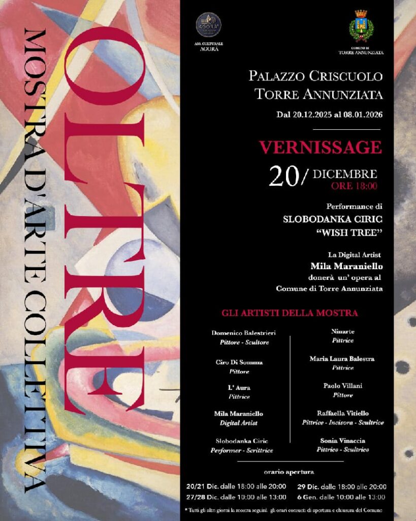Complimenti agli artisti che da ieri espongono le loro opere in occasione della mostra d’arte collettiva “Oltre” organizzata dall’associazione Agorà. Palazzo Criscuolo si conferma ancora una volta hub culturale, capace di attrarre eventi, iniziative e appuntamenti artistici con la presenza, come in questo caso, anche di artisti che arrivano da altre città.