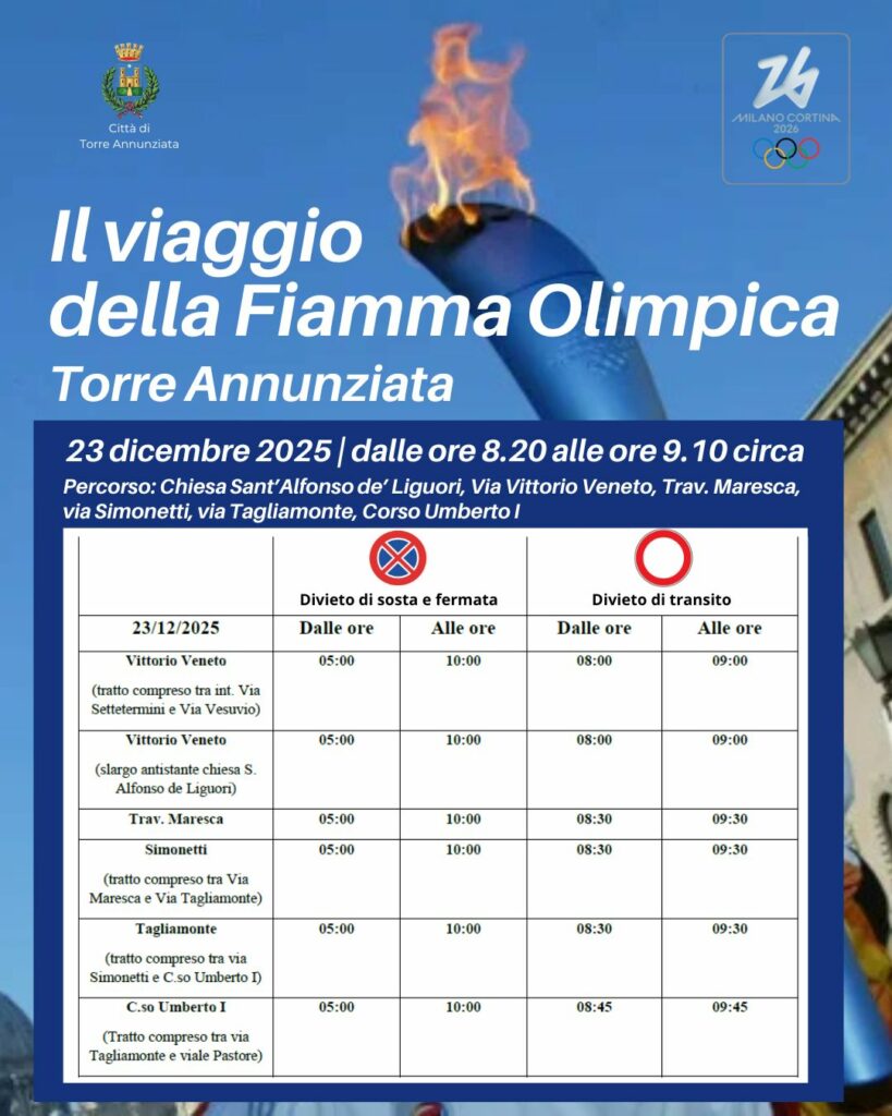 | … l’arrivo della Fiaccola Olimpica dei Giochi Invernali di Milano-Cortina 2026 che arriverà lunedì 22 dicembre davanti a Palazzo Farnese prima di attraversare parte della città in direzione Marina di Stabia. Luigi Vicinanza Sindaco |