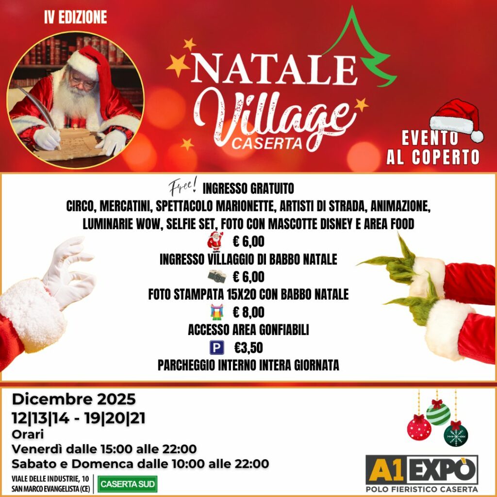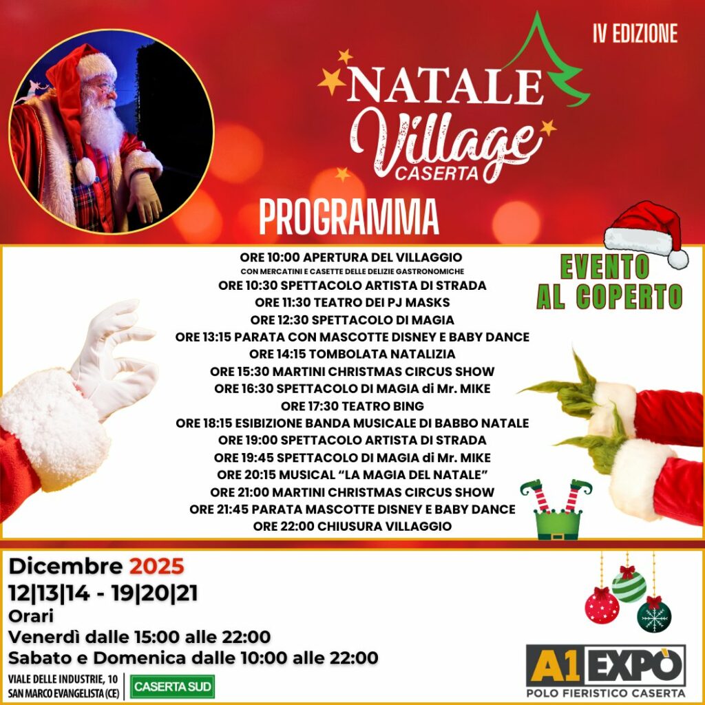 | Arriva il Natale Village! Tre weekend di pura magia per tutta la famiglia, con incontri speciali, luci scintillanti, attrazioni e l’atmosfera natalizia più suggestiva della Campania. #EventoAlCoperto 5–6–7–8 12–13–14 19–20–21 dicembre • Venerdì: 15:00–22:00 • Sabato e Domenica: 10:00–22:00 Info & Contatti 08231766542 |
