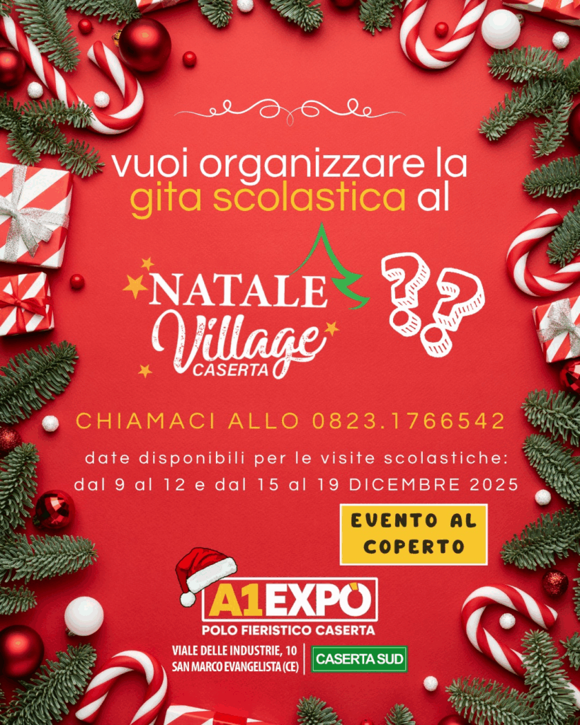 | Natale Village è un evento al coperto dedicato alle famiglie con: – INGRESSO OMAGGIO: Mercatini, spettacolo marionette, spettacolo artisti di strada, spettacolo mascotte Disney, animazione per bambini, dance, luminarie wow con selfie set e area food; – TICKET 6,00 euro: Ingresso al villaggio di Babbo Natale con laboratori: scrivi la letterina, fai il tuo albero di Natale e impacca il regalo, ingresso gratuito per i bambini fino ad 1 anno; – Foto stampata 15×20 con Babbo Natale 6,00 euro; – Area gonfiabili bambini 8,00 euro prima mezz’ora, 2 euro ogni 10 minuti successivi; – Parcheggio interno intera giornata 3,50 euro; I ticket si acquistano all’ingresso. Non bisogna prenotare. Presso Polo Fieristico A1Expò, Viale delle Industrie, 10, San Marco Evangelista (CasertaSud) Dal 5 all’8, dal 12 al 14 e dal 19 al 21 Dicembre 2025 I venerdì dalle ore 15,00 alle ore 22,00 I Sabato e Festivi dalle ore 10,00 alle ore 22,00 |