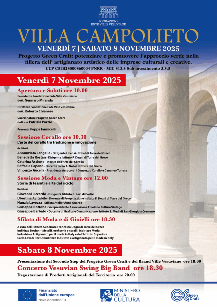 | Assocoral 𝐕𝐢𝐥𝐥𝐚 𝐂𝐚𝐦𝐩𝐨𝐥𝐢𝐞𝐭𝐨 𝐬𝐢 𝐚𝐜𝐜𝐞𝐧𝐝𝐞 𝐝𝐢 𝐚𝐫𝐭𝐞, 𝐜𝐨𝐫𝐚𝐥𝐥𝐨 𝐞 𝐬𝐨𝐬𝐭𝐞𝐧𝐢𝐛𝐢𝐥𝐢𝐭𝐚̀! Il 7 e l’8 novembre prende vita 𝐆𝐫𝐞𝐞𝐧 𝐂𝐫𝐚𝐟𝐭: 𝐥’𝐚𝐫𝐭𝐞 𝐝𝐞𝐥 𝐟𝐚𝐫𝐞 𝐬𝐨𝐬𝐭𝐞𝐧𝐢𝐛𝐢𝐥𝐞, un progetto della Fondazione Ente Ville Vesuviane che unisce artigianato, moda e cultura verde. Nella splendida cornice di Ercolano, parleremo di tradizione e innovazione, di come il nostro saper fare torrese possa diventare modello di sostenibilità e futuro condiviso. Venerdì 7 novembre, alle ore 10:30, la 𝐒𝐞𝐬𝐬𝐢𝐨𝐧𝐞 𝐂𝐨𝐫𝐚𝐥𝐥𝐨 metterà al centro “𝐥’𝐚𝐫𝐭𝐞 𝐝𝐞𝐥 𝐜𝐨𝐫𝐚𝐥𝐥𝐨 𝐭𝐫𝐚 𝐭𝐫𝐚𝐝𝐢𝐳𝐢𝐨𝐧𝐞 𝐞 𝐢𝐧𝐧𝐨𝐯𝐚𝐳𝐢𝐨𝐧𝐞” con gli interventi di: 𝐀𝐧𝐧𝐮𝐧𝐳𝐢𝐚𝐭𝐚 𝐋𝐚𝐧𝐠𝐞𝐥𝐥𝐚 (Istituto A. Nobel) 𝐁𝐞𝐧𝐞𝐝𝐞𝐭𝐭𝐚 𝐑𝐨𝐬𝐭𝐚𝐧 (Istituto F. Degni) 𝐂𝐚𝐭𝐞𝐫𝐢𝐧𝐚 𝐀𝐬𝐜𝐢𝐨𝐧𝐞 (storica dell’arte del corallo) 𝐑𝐚𝐟𝐟𝐚𝐞𝐥𝐞 𝐂𝐚𝐩𝐚𝐧𝐨 (Liceo A. Nobel) 𝐕𝐢𝐧𝐜𝐞𝐧𝐳𝐨 𝐀𝐮𝐜𝐞𝐥𝐥𝐚 (Presidente Assocoral / Consorzio Corallo e Cammeo Torrese) Un’occasione per mostrare come il 𝐜𝐨𝐫𝐚𝐥𝐥𝐨 𝐝𝐢 𝐓𝐨𝐫𝐫𝐞 𝐝𝐞𝐥 𝐆𝐫𝐞𝐜𝐨 continui a dialogare con il mondo contemporaneo, restando simbolo di bellezza, identità e sostenibilità |