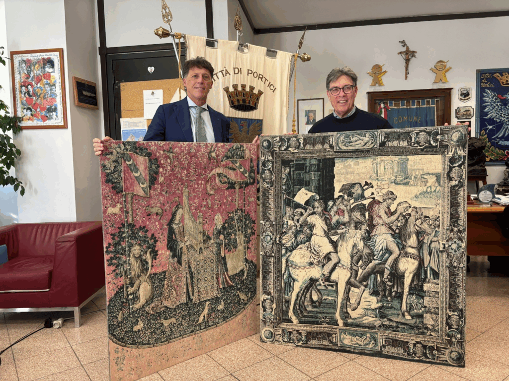 | Enzo Cuomo Sindaco Il dott. Sergio Pipolo, Cittadino porticese, ha inteso donare alla Città di Portici due opere artistiche in tessuto di sua proprietà per la fruizione pubblica della comunità cittadina, di cui è membro come residente e commerciante del territorio in qualità di ottico da più di cinquant’anni. Ci ha donato due tele stampate e dipinte, entrambe di Manifattura italiana, collocabili tra la fine del ‘800 e l’inizio ‘900. La prima raffigura “L’Udito”, copia dall’omonimo arazzo parte del celeberrimo ciclo “La dama e l’unicorno” di Manifattura fiamminga della fine del XV secolo, tra il 1484 e il 1500, conservato al Musée de Cluny di Parigi, che costituisce una delle più importanti opere di arazzeria del medioevo europeo. La seconda tela raffigura “Araldi a cavallo”, copia dall’ omonimo celebre arazzo dedicato alle “Storie di Artemisia” della Manifattura Di Faubourg Saint-Marcel, laboratorio di arazzi attivo a Parigi nei primi decenni del XVII secolo, prima della creazione della più celebre Manufacture des Gobelins. Realizzato tra il 1615 e il 1620, su cartoni di Henri Lerambert e aiuti, è conservato a Palazzo Chiablese a Torino. |