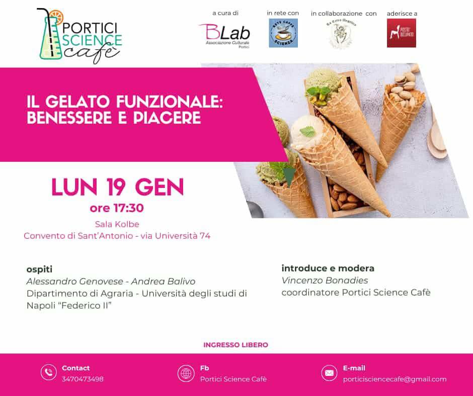 | Tra i dessert più amati e consumati al mondo, capace di ingolosire grandi e piccini, il #gelato sarà il protagonista indiscusso del primo appuntamento del 2026 con il nostro #PorticiScienceCafe! Quando? Lunedì 19 gennaio alle ore 17:30 a Portici, nella Sala Kolbe del Convento di Sant’Antonio, in via Università 74. Protagonisti dell’incontro – promosso come sempre da BLab Associazione culturale in collaborazione, novità di quest’anno, con l’ Associazione La Cetra Angelica -, saranno Alessandro Genovese e Andrea Balivo, rispettivamente docente e ricercatore del Dipartimento di Agraria dell’Università degli studi di Napoli “Federico II”. Con il loro aiuto analizzeremo come la scienza stia sviluppando nuove formulazioni per migliorare il profilo nutrizionale di questo alimento, mantenendo intatto il piacere del gusto, e come il suo futuro possa svilupparsi in una direzione più sostenibile, preservandone al contempo l’essenza che lo rende unico! L’ingresso è libero e gratuito. |