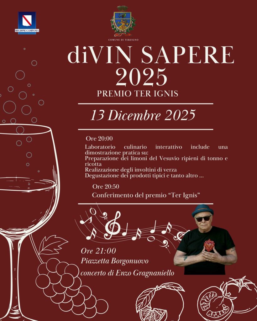 | Terzigno si accende di gusto, tradizione e musica! Il viaggio di diVIN Sapere 2025 continua con uno degli appuntamenti più attesi dell’anno: il Premio Ter Ignis, una serata che unisce eccellenze culinarie, cultura e grandi emozioni. Un’esperienza unica dove i sapori del territorio diventano protagonisti: • Limoni del Vesuvio ripieni di tonno e ricotta • Involtini di verza • Degustazione di prodotti tipici e molto altro… Un riconoscimento dedicato a chi valorizza identità, qualità e tradizione. Gran finale con il concerto di Enzo Gragnaniello, per una serata che scalda il cuore e celebra la magia del Natale. |