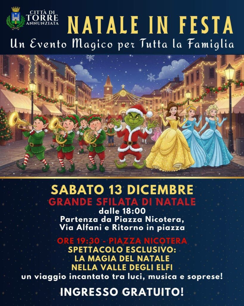 | Continuano le iniziative a Torre Annunziata nell’ambito del programma di eventi “Oplonti e la magia del Natale”. Sabato 13 dicembre e domenica 14 dicembre doppio appuntamento per i bambini e le famiglie in città. Sabato 13 dicembre la grande sfilata di Natale con partenza da piazza Nicotera, percorso fino a via Gino Alfani e rientro in piazza dove si terrà lo spettacolo. Domenica 14 dicembre divertimento e isola pedonale in corso Umberto I (angolo via Maresca a piazza Ernesto Cesaro). #torreannunziata #oplontielamagiadelnatale #eventi |