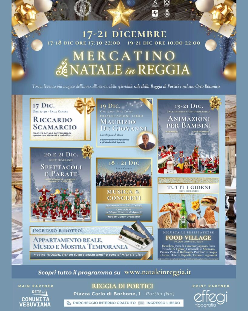 | Ricco di appuntamenti il Programma* della 9° edizione di Natale in Reggia che si svolgerà dal 3 Dicembre 2025 al 6 gennaio 2025 presso la Reggia di Portici. Un evento organizzato dal Dipartimento di Agraria dell’Università Federico II di Napoli in collaborazione con il Centro MUSA e patrocinato dalla Città Metropolitana di Napoli e dalla Città di Portici. |