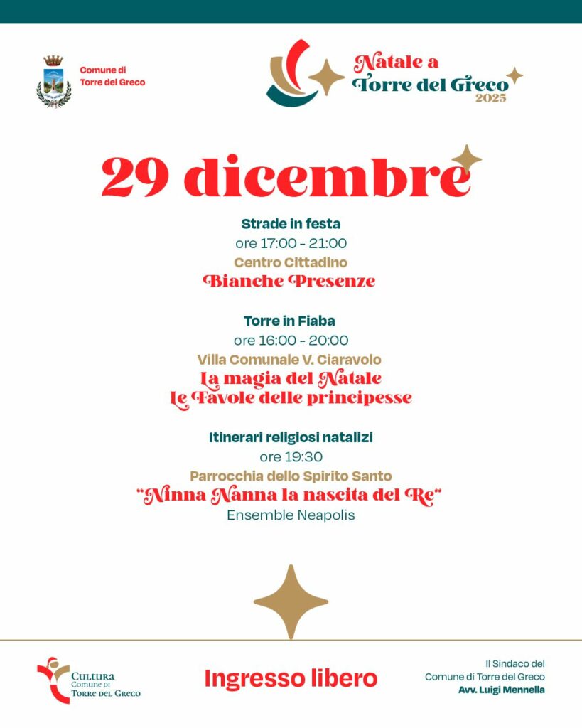 | 𝙊𝙥𝙡𝙤𝙣𝙩𝙞 𝙚 𝙡𝙖 𝙈𝙖𝙜𝙞𝙖 𝙙𝙚𝙡 𝙉𝙖𝙩𝙖𝙡𝙚, 𝙚𝙘𝙘𝙤 𝙞 𝙥𝙧𝙤𝙨𝙨𝙞𝙢𝙞 𝙖𝙥𝙥𝙪𝙣𝙩𝙖𝙢𝙚𝙣𝙩𝙞 𝙞𝙣 𝙥𝙧𝙤𝙜𝙧𝙖𝙢𝙢𝙖 𝙖 𝙏𝙤𝙧𝙧𝙚 𝘼𝙣𝙣𝙪𝙣𝙯𝙞𝙖𝙩𝙖 27 dicembre, h 20.30 – Basilica Madonna della Neve Cantata di Natale 29 dicembre, h 18.00 – Palazzo Criscuolo Presentazione del libro “Napolitiamo” 28 dicembre, h 20.30 – Chiesa S. Michele (Rovigliano) Pina Di Grazia in concerto 27 e 28 dicembre e 3-4-5 gennaio h 19.15, Cripta Spirito Santo Presepe Napoletano Vivente Folklorico 30 dicembre h 18.30, Palazzo Criscuolo Divino Jazz Festival: Mimmo Langella Trio Corrado Cuccurullo Sindaco |