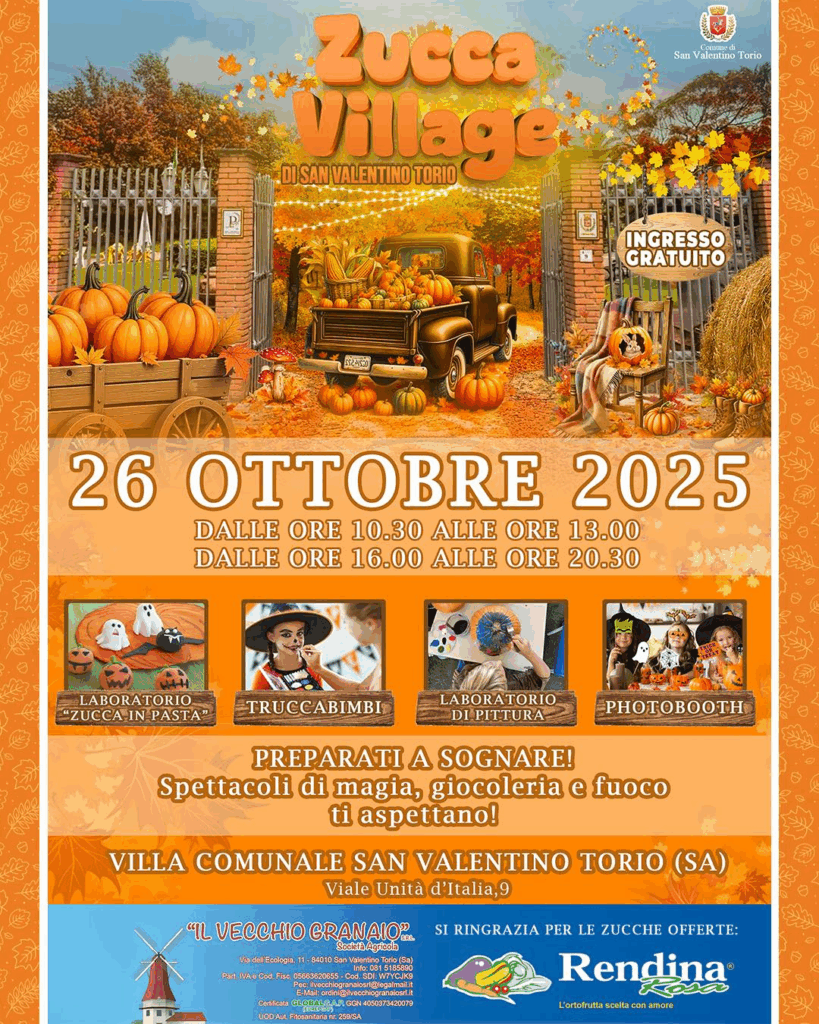 | Scopri la magia dell’autunno con lo ZUCCA VILLAGE DI SAN VALENTINO TORIO!! Preparati a sognare tra spettacoli, animazione, laboratori ricreativi, postazioni fotografiche e tanto altro ancora. L’evento è completamente GRATUITO. Ti aspettiamo Domenica 26 ottobre 2025 dalle ore 10:30 alle 13:00 e dalle 16:00 alle 20:30 presso la Villa Comunale- Viale Unità d’Italia, 9 San Valentino Torio – SA |
