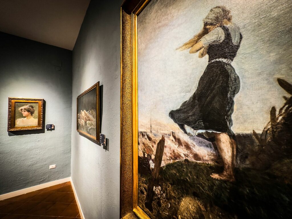 Il percorso si apre con La Civiltà del 1870 di Eurisio Capocci (1871, olio su tela, 80 x 118 cm), opera dal forte contenuto simbolico, in cui l’artista raffigura una donna investita da una folata di vento che le sconvolge il vestito e i capelli che guarda, davanti a un dirupo, un paesaggio stravolto dalla brutalità della guerra. Il dipinto fu presentato all’VIII Promotrice napoletana del 1871 e riproposto alla stessa esposizione del 1888, figura nell’inventario dell’Amministrazione provinciale del 1875. E’ sconvolta dal vento anche la figura femminile ritratta da Michele Tedesco ne La tempesta (1890, olio su tela, 57 x 105 cm): la scena raffigurata è in riva al mare, la spuma creata dalle onde lambisce le gambe della donna, il cui busto e viso sono avvolto da un gran velo scuro che lascia solo intravedere il suo delicato profilo; tutto intorno un cielo oscurato a nuvole grigie. Il dipinto fu esposto alla Promotrice napoletana del 1890. In sala anche Impressioni di una fanciulla di Francesco Sagliano (1876, olio su tela, 42 x 78 cm) che mostra il versante più intimista dell’artista casertano, la piccola Figurina di Edoardo Gallì (inizio secolo XX, olio su tavola, 25 x 42 cm) dialoga con le opere di formato maggiore: e il suggestivo Sogni di Carmine Toro (1890, olio su tela, 133 x 93 cm), opera di impronta simbolista e la sensualità di Pallida Mors di Mario Borgoni 1891 (olio su tela, cm 75×115). Il titolo di quest’ultima opera è tratto da un verso di un’ode di Orazio sulla caducità della vita. Borgoni riprende la grande tradizione italiana del nudo femminile, dipinto su un letto sfatto con una luce proveniente dall’alto che ne disegna i volumi. La tela fu presentata alla XXVII Promotrice napoletana ed entra negli inventari del 1912 della Provincia di Napoli. Completano la sala due pregevoli opere su carta: Mezza Figura in bianco di Giuseppe De Sanctis (1890, pastello su cartoncino, 52 x 35 cm), raffinato esempio della tecnica del pastello applicata al ritratto femminile e Settembrina di Mario Borgoni (1890, pastello su carta, 73 x 120 cm), che cattura con delicatezza la stagione autunnale dipingendo una ragazza sorridente a figura intera, in un luminoso paesaggio campestre, con una gerla d’uva in bella mostra ai suoi piedi. In dialogo con le pitture anche una scultura: Clara di Giuseppe Renda (1890, marmo bianco, h 49 cm): la testa di una donna dai lineamenti classici, con un mento volitivo e uno sguardo malinconico. L’opera è registrata negli inventari dell’Ente di piazza Matteotti nel 1912.