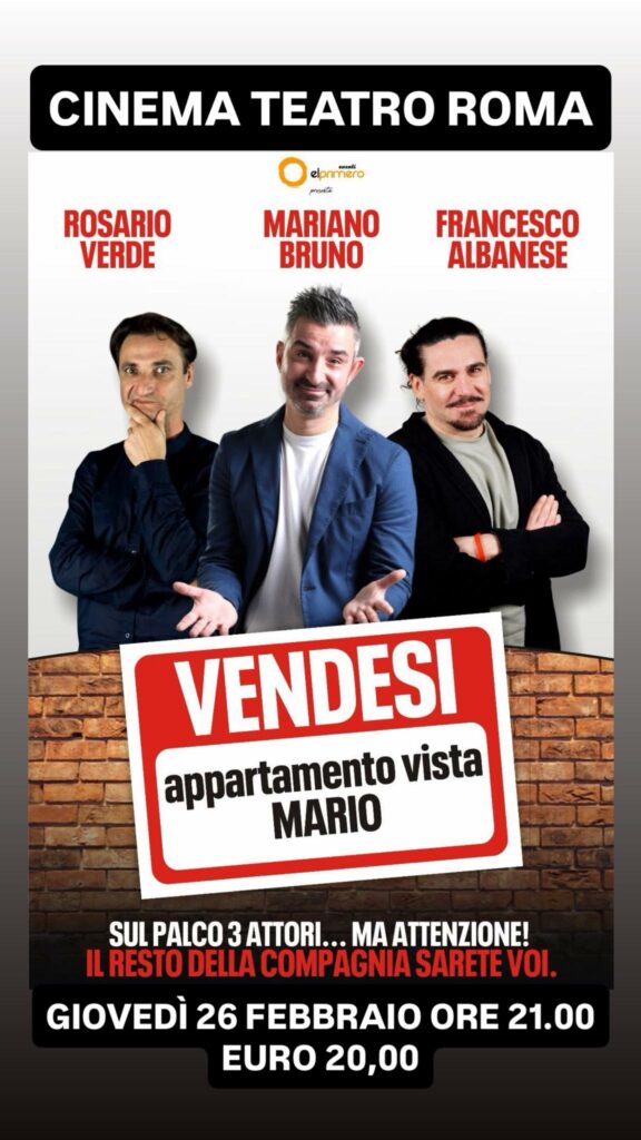 Giovedì 26 Febbraio 2026 ci sarà lo spettacolo teatrale “VENDESI APPARTAMENTO VISTA MARIO”con Mariano Bruno, Rosario Verde e Francesco Albanese, una divertentissima commedia Cinema Teatro Roma