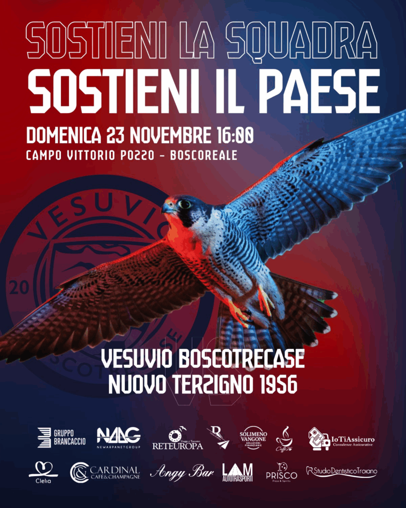 | Vesuvio Boscotrecase > Domenica 23 • Ore 16:00 > Un ringraziamento speciale ad Angy Bar. Da oltre trent’anni, un punto di riferimento nel cuore di Piazza Sant’Anna e nella vita della nostra comunità. Siamo orgogliosi di questa collaborazione con una realtà storica che, come noi, porta avanti valori di tradizione, passione e appartenenza Un simbolo che unisce squadra, territorio e comunità. > Il Vesuvio Boscotrecase è orgoglioso di annunciare una scelta innovativa e profondamente legata all’identità del nostro territorio. Non un singolo vertice, ma un gruppo compatto di persone che rappresentano la collettività, l’unità e lo spirito di collaborazione del nostro Paese. La presidenza condivisa è il simbolo di una comunità che non lascia spazio a individualismi: si lavora spalla a spalla, ognuno con la propria passione e dedizione, con un unico obiettivo comune – far crescere il Vesuvio Boscotrecase e portare in alto il nome della nostra terra. Insieme, senza che nessuno prevalga sull’altro, costruiamo un progetto che mette al centro il valore della squadra, dentro e fuori dal campo. Perché crediamo che “United we stand”, solo uniti si vince. Il Vesuvio Boscotrecase non è solo una squadra: è il riflesso di un popolo che crede nella forza della condivisione, nella partecipazione di tutti e nell’orgoglio di appartenere a questa comunità |