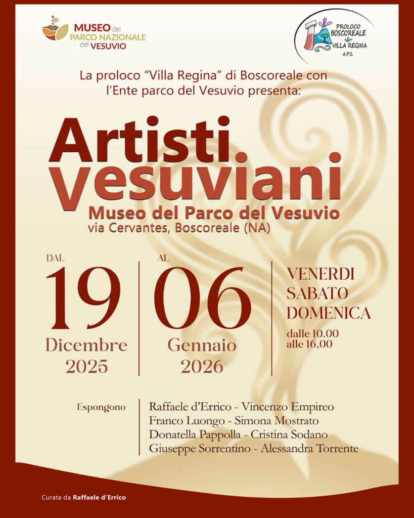 | La Proloco “Villa Regina” di Boscoreale con l’Ente parco del Vesuvio, presenta: 𝐀𝐫𝐭𝐢𝐬𝐭𝐢 𝐕𝐞𝐬𝐮𝐯𝐢𝐚𝐧𝐢 – 𝐌𝐮𝐬𝐞𝐨 𝐝𝐞𝐥 𝐏𝐚𝐫𝐜𝐨 𝐝𝐞𝐥 𝐕𝐞𝐬𝐮𝐯𝐢𝐨 via Cervantes, Boscoreale (NA) dal 19 Dicembre 2025 al 6 Gennaio 2026 venerdì – sabato – domenica dalle 10.00 alle 16.00 Museo del Parco Nazionale del Vesuvio Istituto Comprensivo “Castaldi Rodari” Boscoreale |