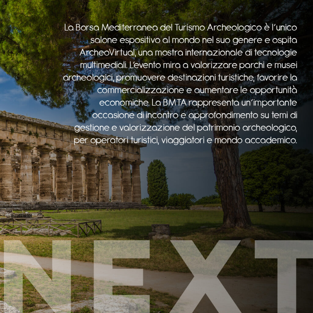Vivi il futuro del turismo archeologico. La nuova edizione della Borsa Mediterranea del Turismo Archeologico accende i riflettori sulla bellezza e il valore del patrimonio archeologico nel suggestivo scenario di Paestum: un’occasione unica per operatori, studiosi e appassionati di storia, tecnologia e viaggi.