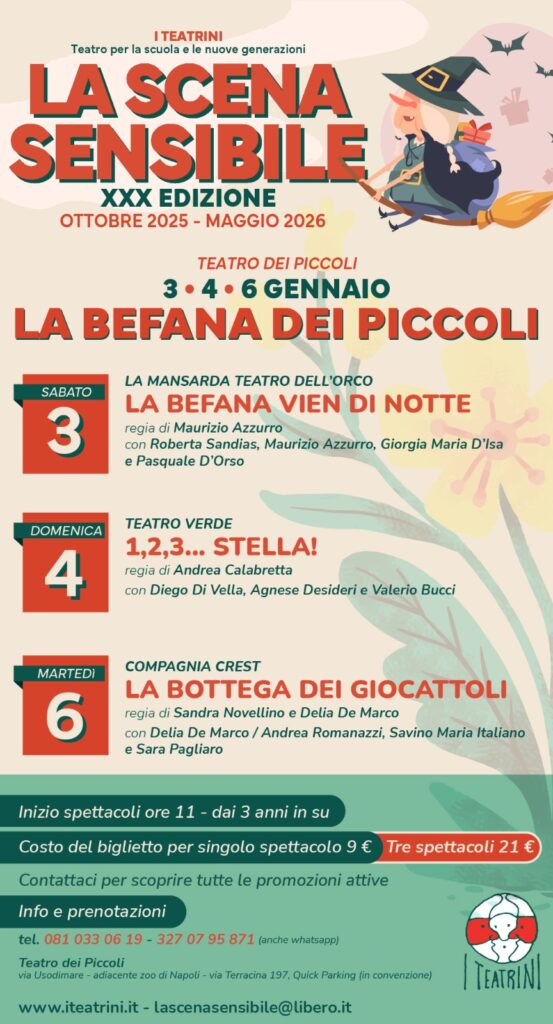 | La Befana al Teatro dei Piccoli di Napoli Sabato 3 Gennaio, ore 11 𝗟𝗔 𝗕𝗘𝗙𝗔𝗡𝗔 𝗩𝗜𝗘𝗡 𝗗𝗜 𝗡𝗢𝗧𝗧𝗘 con la Comp. La Mansarda Teatro Dell’orco Domenica 4 Gennaio, ore 11 𝟭, 𝟮, 𝟯,… 𝗦𝗧𝗘𝗟𝗟𝗔! con il Teatro Verde Martedì 6 Gennaio, ore 11 𝗟𝗔 𝗕𝗢𝗧𝗧𝗘𝗚𝗔 𝗗𝗘𝗜 𝗚𝗜𝗢𝗖𝗔𝗧𝗧𝗢𝗟𝗜 con CREST – Compagnia Teatrale Prenota subito ai numeri 𝟬𝟴𝟭𝟬𝟯𝟯𝟬𝟲𝟭𝟵 e 𝟯𝟮𝟳𝟬𝟳𝟵𝟱𝟴𝟳𝟭(anche whatsapp) e scopri le promozioni che ti abbiamo riservato |