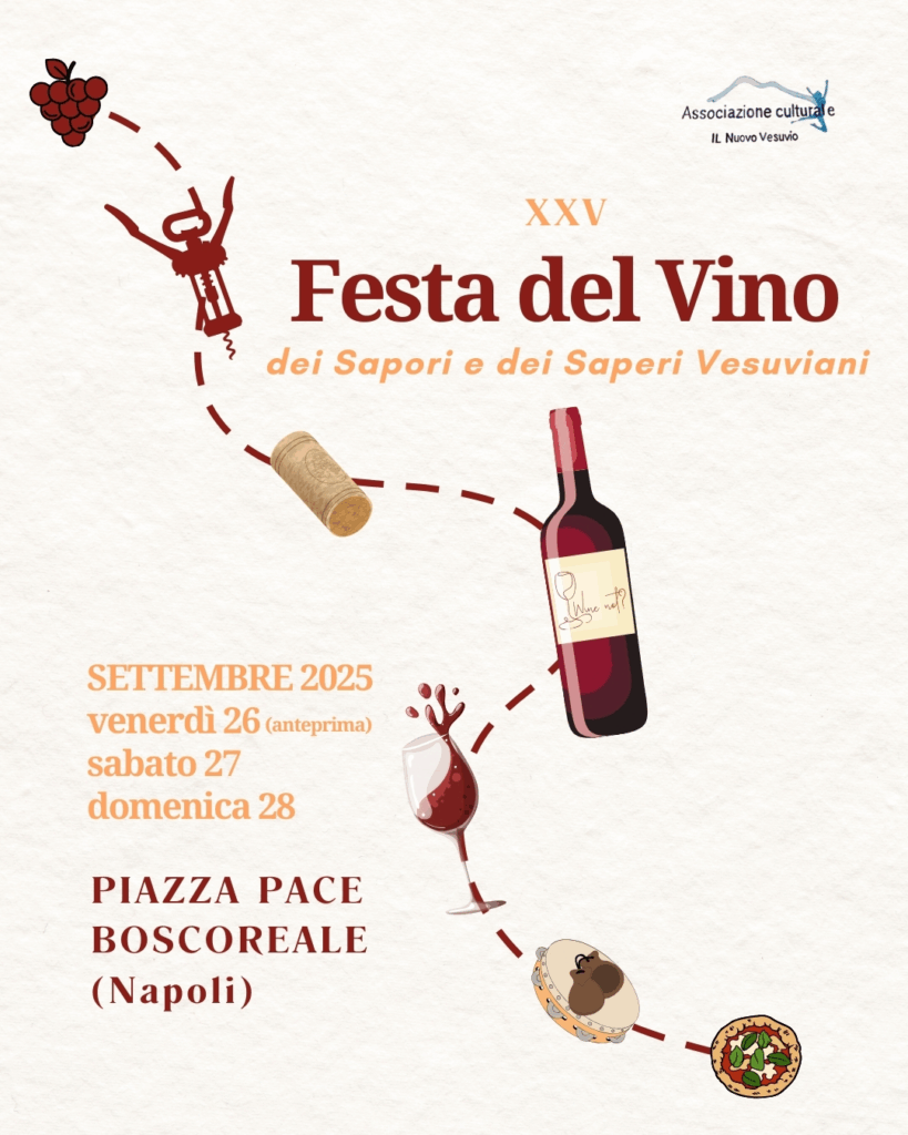 Quest’anno festeggiamo 25 edizioni di gusto, tradizione e divertimento! Sabato 27 e Domenica 28 settembre – Percorso enogastronomico e sensoriale nel cuore del centro storico di Boscoreale, tra vini locali, piatti tipici, artigianato e spettacoli.