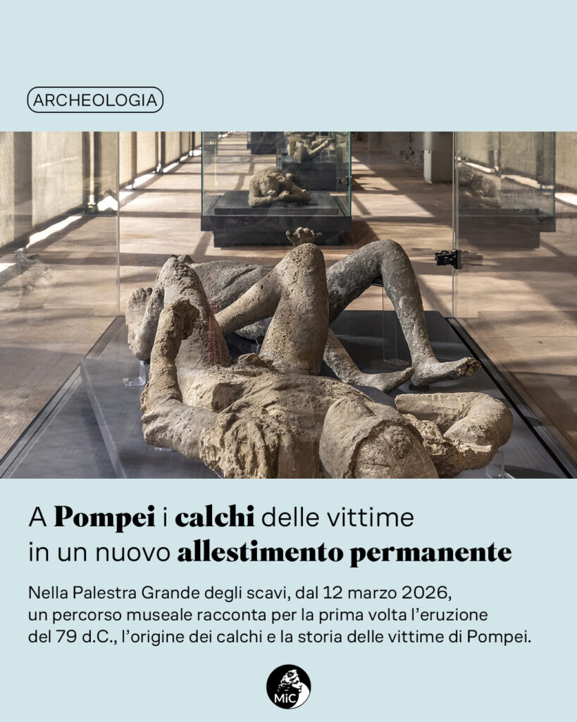 Un “memoriale” che racconta la fine di Pompei e le sue vittime. L’eruzione del 79 d. C. – che ha colpito migliaia di persone e fatto della antica città vesuviana una testimonianza unica nella storia – per la prima volta viene narrata attraverso un allestimento museale permanente che ne restituisce la storia momento per momento, esponendo i calchi delle vittime e una selezione di reperti organici straordinariamente conservati. Sarà visitabile alla Palestra Grande degli scavi, dal 12 marzo 2026.