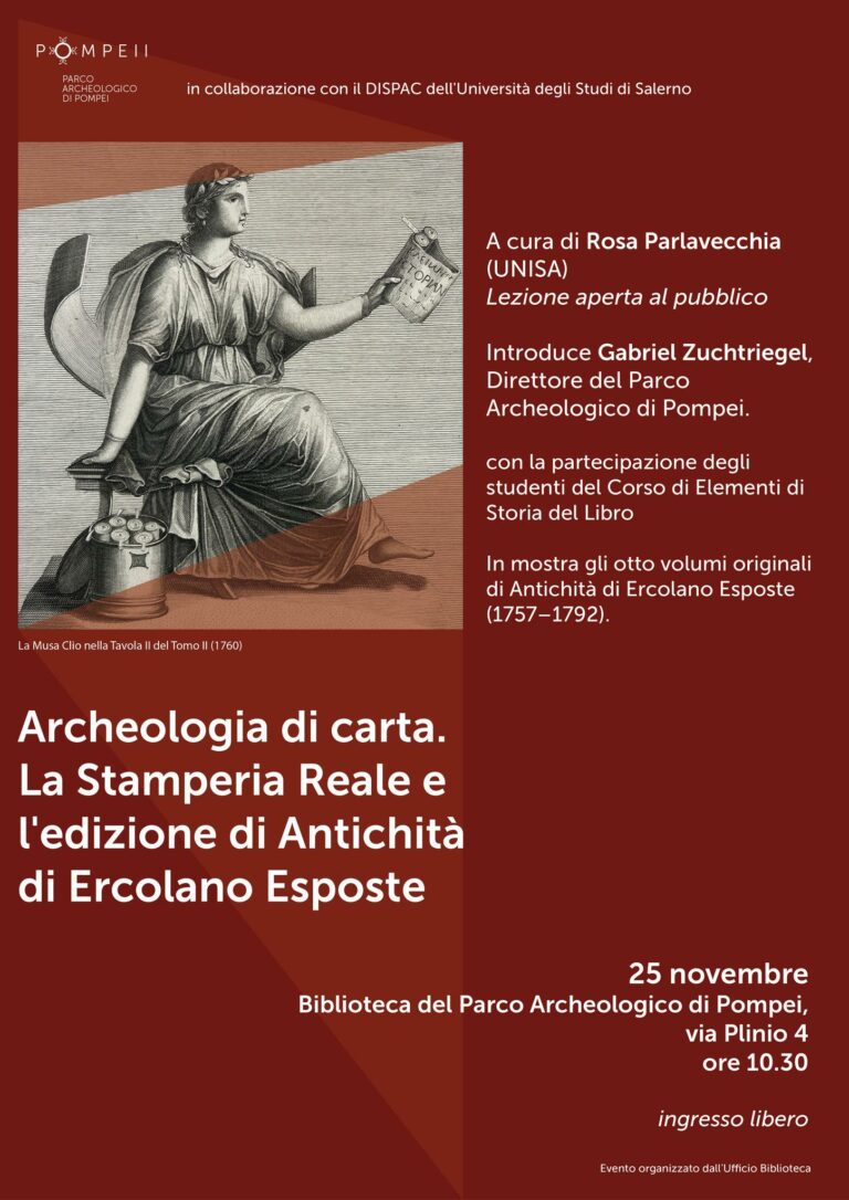 Al Parco Archeologico di PompeiLezione aperta al pubblico, in collaborazione con il DISPAC dell’Università di Salerno “Archeologia di carta. La Stamperia Reale e l’edizione di
