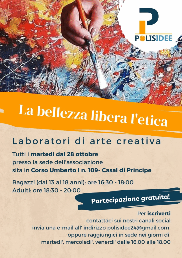 “LA BELLEZZA LIBERA L’ ETICA” L’ associazione civico- culturale PolisIdee promuove un LABORATORIO gratuito diARTE CREATIVA, per ragazzi e per adulti,tutti i martedi’ dal 28